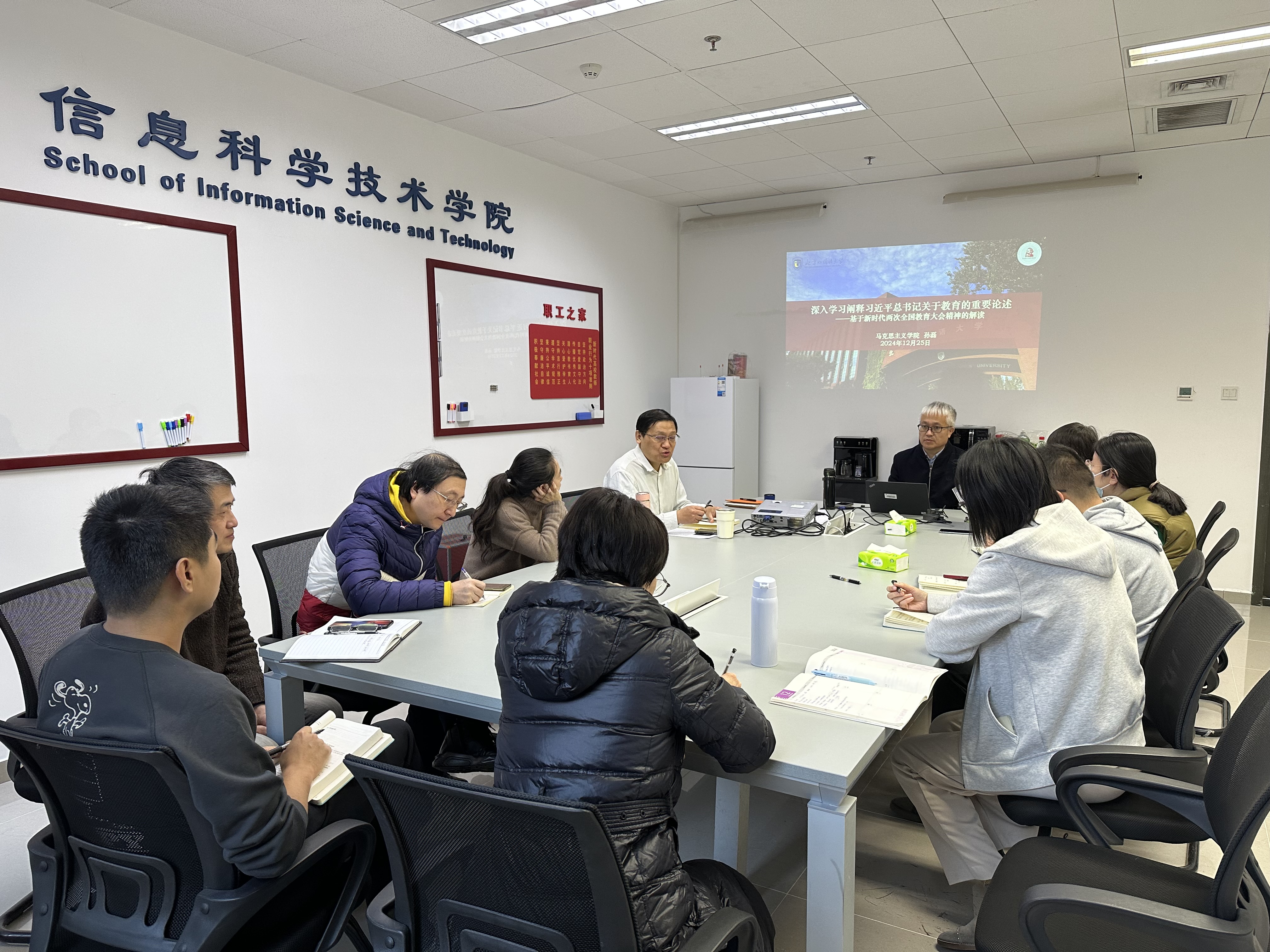 2024年12月25日上午,beat365在线唯一官网召开2024年度第十次全体教师集体学习,邀请马克思主义学院孙磊老师做《深入学习阐释习近平总书记关于教育的重要论述——基于新时代两次全国教育大会精神的解读》报告,学习会由学院党总支书记梁野主持,全体教职工参加学习会。孙磊老师首先对比分析了2018年和2024年两次全国教育大会的篇章结构与内容,细致阐述了两次大会的异同点,详细解读了两次大会的核心主题“坚持中国特色社会主义教育发展道路 ...