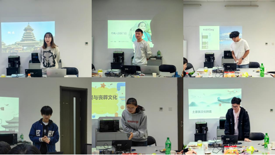 各民族学生代表先后就本民族特色文化进行分享。侗族代表王孝媛分享了民族服饰侗布、语言文学、建筑及饮食,展现了人与自然和谐共处的智慧,并以侗语俗语“山高比不过人的志气高”与大家共勉。穿青人族代表周健揭秘其称谓、分布、信仰及婚丧习俗,强调穿青人在现代化中坚持文化传承与创新的平衡。壮族同学韦凯良、黄梓瑜、卢茜分别展示了壮语、服饰、节日及非物质文化遗产,如三月三歌节与织棉绣球,彰显壮族文化的多彩与融合。藏族代表洛桑扎杰从藏民族起源讲起,介绍了藏文藏语的独特魅力及其在现代化中的保护与传承,同时分享了宗教信仰与生活方式的现代融合。土家族的姚源瀚、吴小乐、冉一洲则展示了土家族蛊术、婚丧习俗及饮食文化。大家就各民族独特的文化习俗展开热烈讨论。