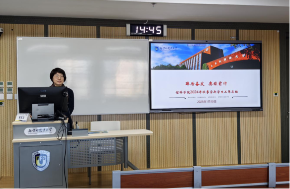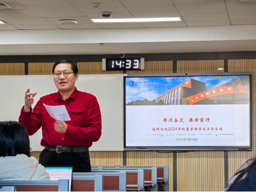 1月10日下午,信息科学技术学院召开了全体学生期末大会。会议由辅导员赵韵怡主持,学院党总支书记梁野、党总支副书记刘玉华出席并讲话。