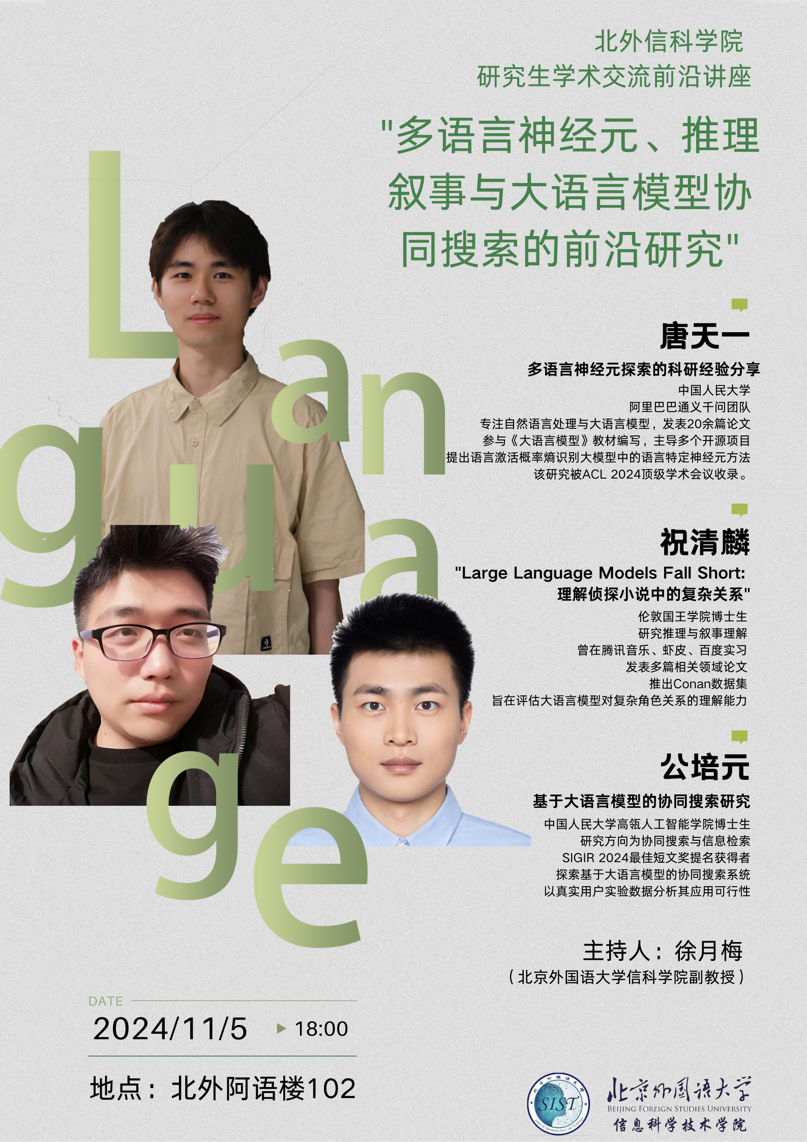 本次讲座内容包括大语言模型的协同搜索系统、大语言模型的多语言神经元探究、以及大语言模型复杂推理理解的探讨。