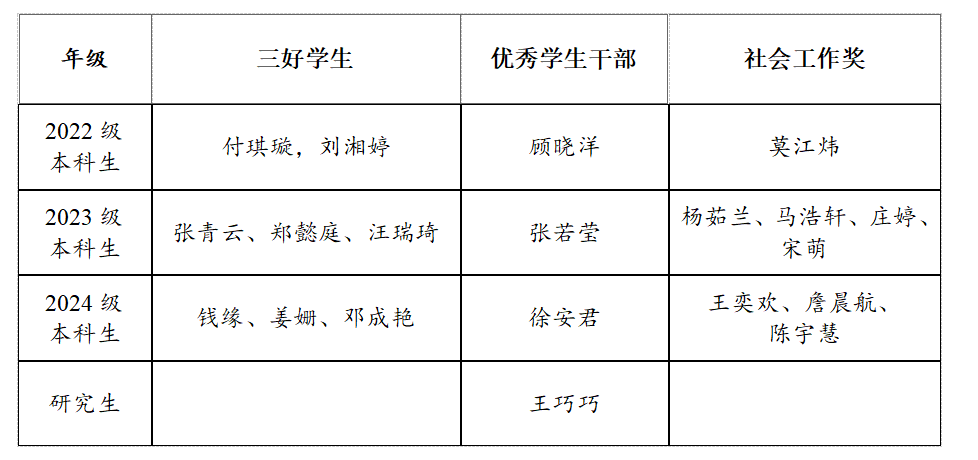 根据《beat365在线唯一官网学生资助工作管理规定》《beat365在线唯一官网学生评优工作条例》,结合学校《关于开展2024-2025学年三好学生、优秀学生干部、社会工作奖评审工作的通知》具体要求,经学生个人申报、班级推荐审核、学院评奖评优工作领导小组审定,学院2024-2025年度三好学生、优秀学生干部、社会工作奖评审结果如下(排名不分先后):